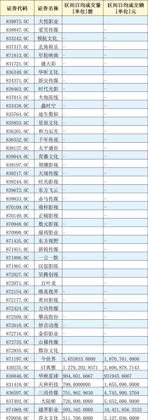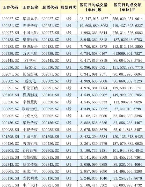 25只A股影視股票,則每天都有成交,平均一天成交最低的中廣天擇也有210萬股成交量和6508萬成交額,超過了成交額最高的森宇文化;成交高的【華誼兄弟(300027)、股吧】,平均一天成交2374股,金額是5.5602億,是森宇文化的18倍,零頭都是森宇文化成交額的兩倍多。