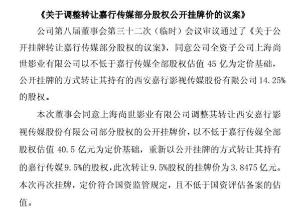 11月6日,A股上市公司東方明珠發(fā)布公告,同意子公司尚世影業(yè)掛牌出售嘉行傳媒9.5%的股權(quán),出售的價格不再以嘉行傳媒整體估值45億元計算,而是40.5億元。