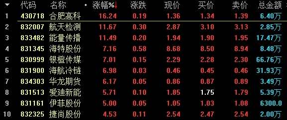 基礎(chǔ)層107只股票完成交易,36只股票上漲,21只股票漲幅超10%,金發(fā)股份(872267)、中成發(fā)展(833988)、山東眾和(832466)漲100%居漲幅榜榜首;另有35只股票下跌,22只跌幅超10%,地林偉業(yè)(430416)、九天利建(837189)跌50%居跌幅榜榜首。