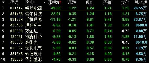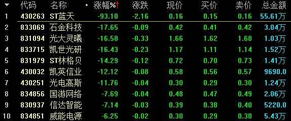 做市股跌幅榜方面,創(chuàng)新層峻嶺能源(831417)跌49.59%居創(chuàng)新層跌幅榜榜首;基礎(chǔ)層ST藍(lán)天(430263)跌93.10%居基礎(chǔ)層跌幅榜榜首。
