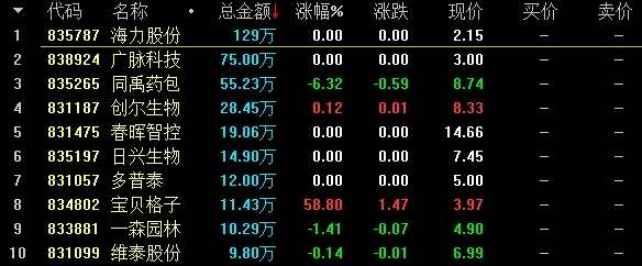 創(chuàng)新層競價(jià)交易股票盤內(nèi)成交額前十名