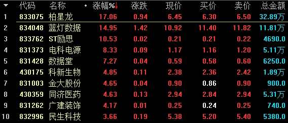 競價(jià)交易方面,今日共155只股票完成交易。其中,創(chuàng)新層48只股票完成交易,23只股票上漲,7只股票漲幅超10%,易簡集團(tuán)(834498)漲100%居漲幅榜榜首;另有11只股票下跌,4只股票跌幅超10%,美天生物(833833)跌27.14%居跌幅榜榜首。