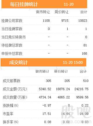 20日共有510只股票發(fā)生交易,成交金額2.42億元,做市轉(zhuǎn)讓成交0.53億元,協(xié)議轉(zhuǎn)讓成交1.89億元,成交數(shù)量9599.56萬股。