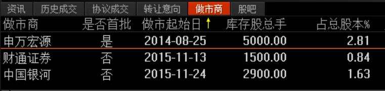 目前,ST藍天的做市商有3家,分別為申萬宏源、財通證券(601108)及中國銀河(601881)。最多的時候,ST藍天有8家做市商。
