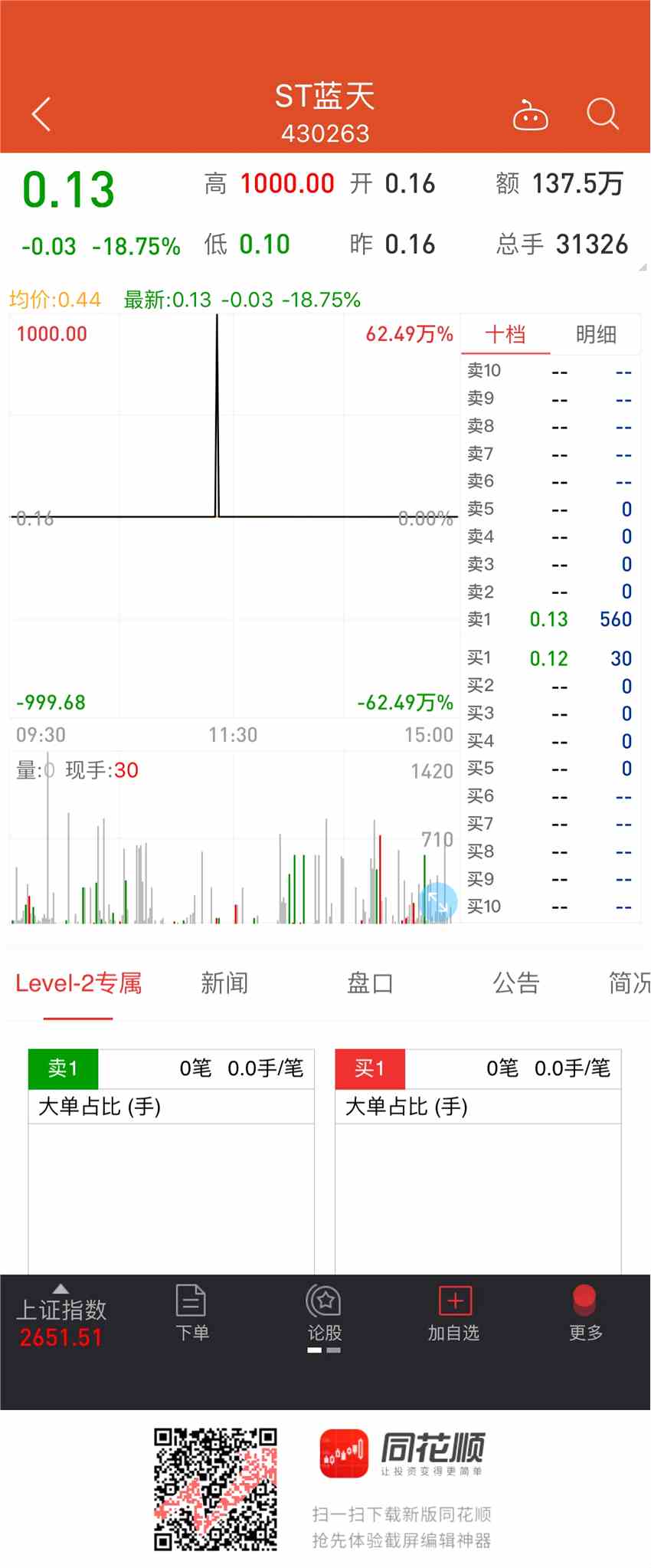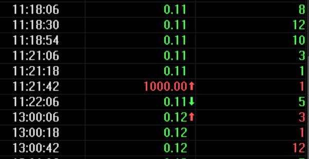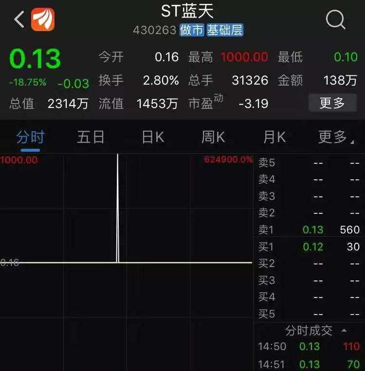 今日上午11:21:42,ST藍天上演驚天“烏龍指”,成交價高達1000元/股,成交量1手(1000股),成交總額為100萬元。要知道,ST藍天的今天開盤價只有0.16元/股,全天收盤于0.13元/股。