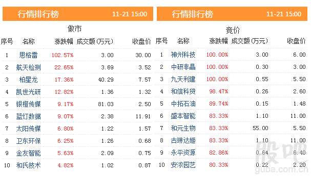 從新三板股票的市場表現(xiàn)來看,21日有4只股票漲幅超過100%,共有20只個股漲幅超過30%。