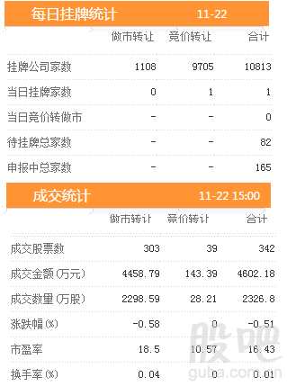 22日共有342只股票發(fā)生交易,成交金額0.46億元,做市轉(zhuǎn)讓成交0.45億元,協(xié)議轉(zhuǎn)讓成交0.01億元,成交數(shù)量2326.80萬股。