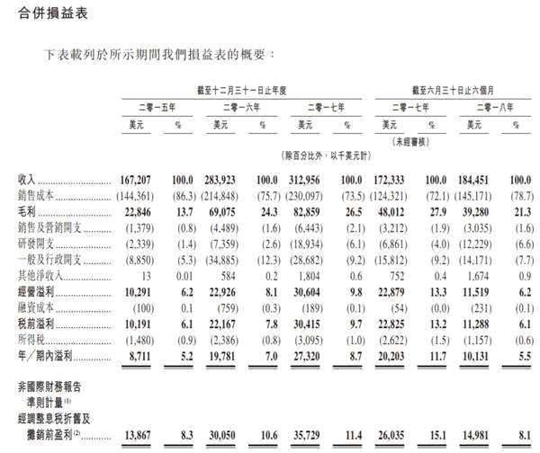 財(cái)務(wù)數(shù)據(jù)顯示,其2015年、2016年、2017年、2018年前6月(下稱報(bào)告期內(nèi))分別實(shí)現(xiàn)收入為1.67億美元、2.83億美元、3.12億美元、1.84億美元;同期對應(yīng)的期內(nèi)溢利分別為871.1萬美元、1978.1萬美元、2730萬美元、1013.1萬美元。