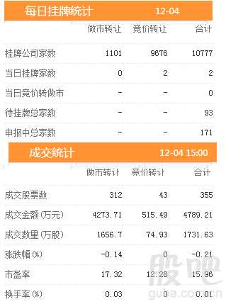 4日新增掛牌企業(yè)2家,掛牌企業(yè)總數(shù)達(dá)到10777家,做市轉(zhuǎn)讓1101家,協(xié)議轉(zhuǎn)讓9676家,待掛牌總家數(shù)93只,申報中總家數(shù)達(dá)到171家。