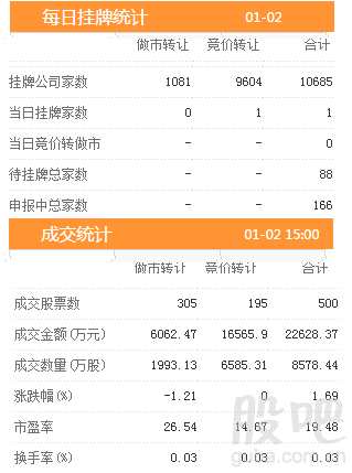 2日新增掛牌企業(yè)1家,掛牌企業(yè)總數(shù)達到10685家,做市轉(zhuǎn)讓1081家,協(xié)議轉(zhuǎn)讓9604家,待掛牌總家數(shù)88只,申報中總家數(shù)達到166家。