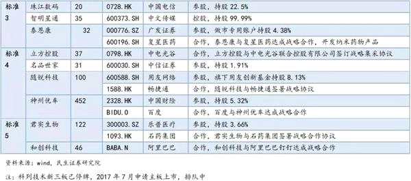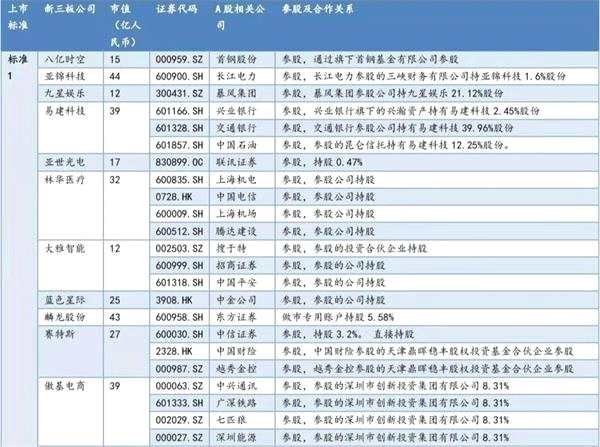 民生證券研報指出,科創(chuàng)板采用以市值為中心、以凈利潤、營業(yè)收入、研發(fā)投入等指標(biāo)為輔助標(biāo)準(zhǔn)的5套標(biāo)準(zhǔn),同時放寬大市值紅籌企業(yè)上市門檻,上市標(biāo)準(zhǔn)多元包容。按照上述標(biāo)準(zhǔn)對新三板企業(yè)進(jìn)行篩選,符合標(biāo)準(zhǔn)一至四的企業(yè)分別為350家、21家、10家、56家。民生證券梳理了部分具備上科創(chuàng)板潛力新三板公司及背后A股關(guān)系,具體如圖: