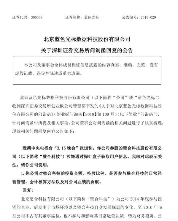 3月17日晚間,藍色光標發(fā)布關(guān)于深圳證券交易所問詢函回復的公告稱,藍色光標自2016年6月28日后,已不占有璧合科技的董事席位,也未參與其日常運營決策。公司未曾涉及或參與媒體報道的璧合科技相關(guān)業(yè)務(wù),也未與該項產(chǎn)品有任何業(yè)務(wù)往來。