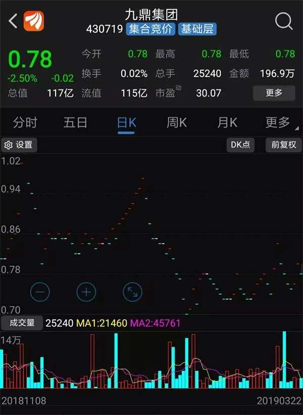 尤其是進(jìn)入2019年,九鼎集團(tuán)52個(gè)交易日僅成交1.5億元,日均成交額約288萬元。
