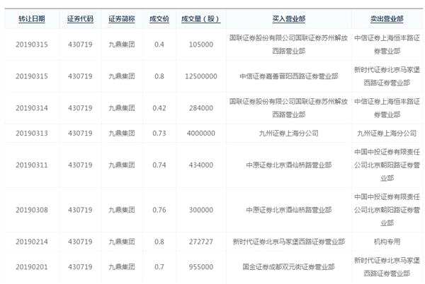 比如3月15日,九鼎集團(tuán)就出現(xiàn)兩筆協(xié)議轉(zhuǎn)讓信息,當(dāng)天“【中信證券(600030)、股吧】嘉善晉陽西路證券營(yíng)業(yè)部”以0.8元/股的價(jià)格,買入1250萬股九鼎集團(tuán),單筆成交額就達(dá)1000萬元。