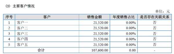 以2017年為例,當(dāng)年賽普健身前五大客戶均為個(gè)人,且這五名客戶銷(xiāo)售金額均為2.15萬(wàn)元,5為大客戶銷(xiāo)售額合計(jì)僅10.76萬(wàn)元,占公司營(yíng)業(yè)收入的比重為0.00%。