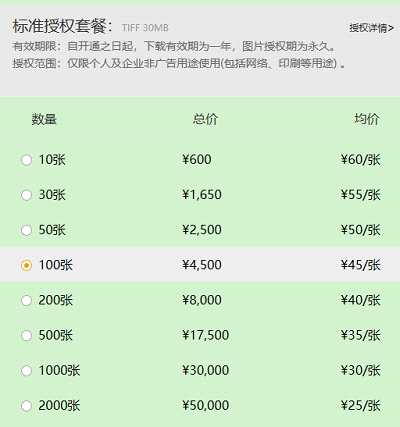 記者獲得的資料顯示,全景網(wǎng)絡(luò)對每張圖片索賠的金額為一萬元。在其官網(wǎng)上,單張圖片授權(quán)使用的價格在25元至60元之間。
