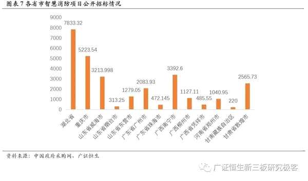 根據(jù)中國政府采購網(wǎng)統(tǒng)計(jì)可知,湖北省、山東省、重慶市、廣西省、廣東省智慧消防項(xiàng)目具體如下:湖北省:7535.14萬元;山東省:共4416.52萬元,其中威海市2836.07萬、煙臺市301.4萬、東營市1279.05萬;重慶市:5223.54萬;廣西?。汗?805.41,其中南寧市3392.6萬、柳州市1127.11萬、憑祥市285.7萬;廣東省:共2282.79,其中廣州市2283.93萬、珠海市198.86萬。湖北省位居已公開招標(biāo)總金額榜首,重慶市第二,其次是威海市,南寧市,敦煌市。在2017年公安部消防局發(fā)布《關(guān)于全面推進(jìn)“智慧消防”建設(shè)的指導(dǎo)意見》之前,公安部消防局已經(jīng)開始籌劃智慧消防的建設(shè)。最早布局的是湖北省宜昌市,安徽省蕪湖市,江蘇省無錫市。2016年7月18日,公安部消防局將湖北確定為全國開展消防大數(shù)據(jù)應(yīng)用試點(diǎn)單位之一。省委、省政府同意后,省委政法委決定投資9000萬元建設(shè)湖北“智慧消防”,并被列入“智慧湖北”建設(shè)項(xiàng)目。2018年1月18日,湖北省公安消防總隊(duì)智慧消防采購項(xiàng)目(1234工程)公開招標(biāo)金額達(dá)到7535.14。
