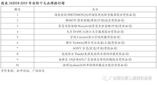??低暋⒋笕A股份營收規(guī)模過百億,堅(jiān)瑞沃能、天廣中茂營收不到40億。2018-2019年,安防行業(yè)前十大企業(yè)??低?、大華股份分別排名第一、第四。這些大型企業(yè)綜合實(shí)力、研發(fā)能力、議價能力、品牌影響力更強(qiáng)。