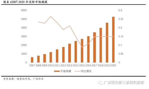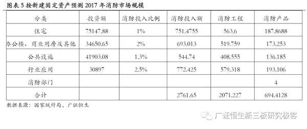 市場化的推行下,消防行業(yè)市場規(guī)模逐漸形成。下游產(chǎn)業(yè)鏈主要包括:住宅和辦公樓、商業(yè)用房等民用建筑市場;冶金、電力等行業(yè)應(yīng)用市場和消防部隊(duì)裝備市場,根據(jù)固定資產(chǎn)投資額和消防經(jīng)費(fèi),測算 2017年消防市場容量合計(jì)約 2761.65億元,消防產(chǎn)品市場規(guī)模是694.4128億元,消防工程市場規(guī)模2071.227億元。并且估計(jì)2020年消防市場規(guī)??蛇_(dá)5200億元。