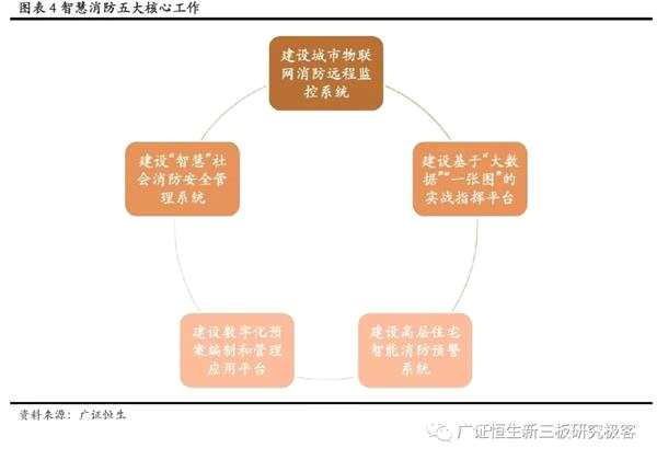 《關(guān)于全面推進(jìn)“智慧消防”建設(shè)的指導(dǎo)意見》明確指出智慧消防工作的核心內(nèi)容:1、建設(shè)城市物聯(lián)網(wǎng)消防遠(yuǎn)程監(jiān)控系統(tǒng);2、建設(shè)基于“大數(shù)據(jù)”“一張圖”的實(shí)戰(zhàn)指揮平臺;3、建設(shè)高層住宅智能消防預(yù)警系統(tǒng);4、建設(shè)數(shù)字化預(yù)案編制和管理應(yīng)用平臺;5、建設(shè)“智慧”社會消防安全管理系統(tǒng)。該意見要求綜合運(yùn)用物聯(lián)網(wǎng)、云計(jì)算、大數(shù)據(jù)、移動互聯(lián)網(wǎng)等新興信息技術(shù),加速“智慧消防”建設(shè),全面推進(jìn)信息化與消防業(yè)務(wù)工作的深度融合,構(gòu)建立體、全覆蓋的社會火災(zāi)防控體系,打造符合實(shí)戰(zhàn)要求的現(xiàn)代消防警務(wù)勤務(wù)機(jī)制,提供有力支撐,全面提升社會火災(zāi)防控能力、不對滅火應(yīng)急救援能力和隊(duì)伍管理水平,實(shí)現(xiàn)“傳統(tǒng)消防”向“現(xiàn)代消防”的轉(zhuǎn)變。
