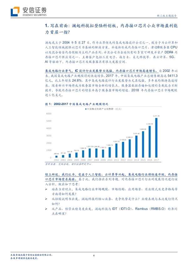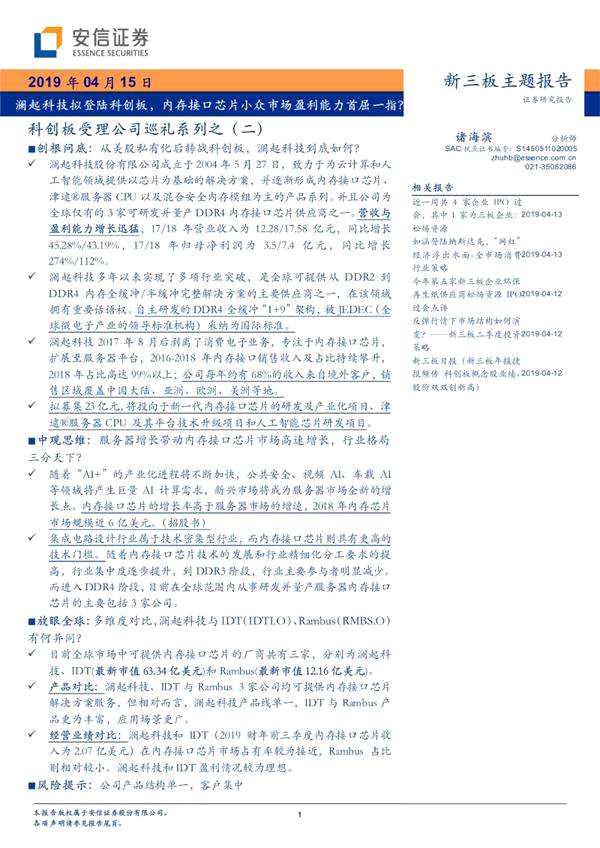 摘要 【瀾起科技擬登陸科創(chuàng)板,內(nèi)存接口芯片小眾市場盈利能力首屈一指?】集成電路設計行業(yè)屬于技術密集型行業(yè),而內(nèi)存接口芯片則具有更高的技術門檻。隨著內(nèi)存接口芯片技術的發(fā)展和行業(yè)精細化分工要求的提高,行業(yè)集中度逐步提升,到DDR3階段,行業(yè)主要參與者明顯減少。而進入DDR4階段,目前在全球范圍內(nèi)從事研發(fā)并量產(chǎn)服務器內(nèi)存接口芯片的主要包括3家公司。(微信公眾號諸海濱新三板研究) 瀾起科技擬登陸科創(chuàng)板,內(nèi)存接口芯片小眾市場盈利能力首屈一指?