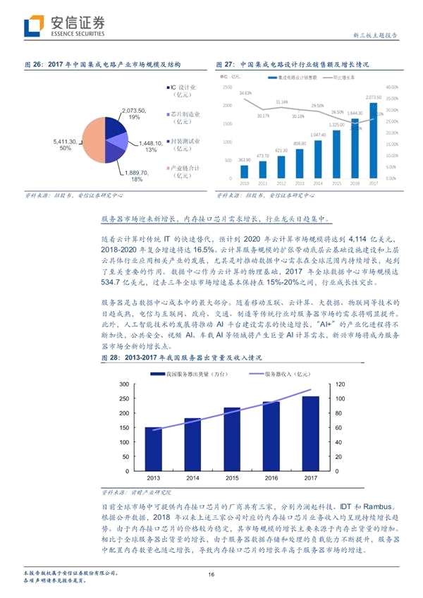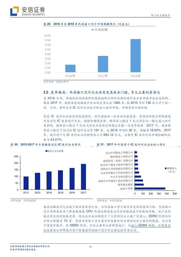 隨著“AI+”的產(chǎn)業(yè)化進程將不斷加快,公共安全、視頻AI、車載AI等領域將產(chǎn)生巨量AI計算需求,新興市場將成為服務器市場全新的增長點。內(nèi)存接口芯片的增長率高于服務器市場的增速,2018年內(nèi)存芯片市場規(guī)模近6億美元。(招股書)