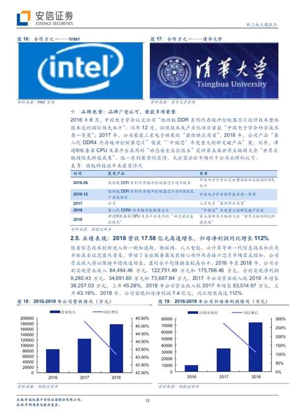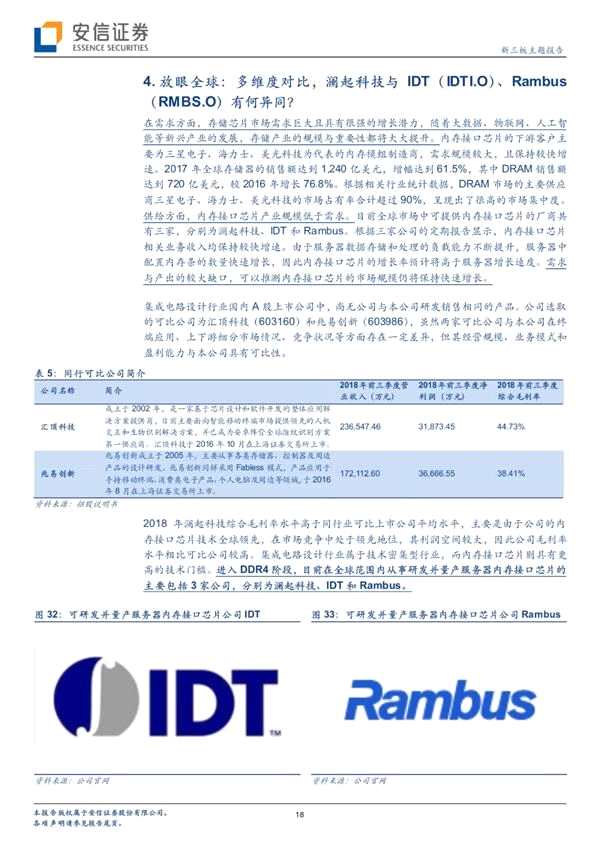 瀾起科技股份有限公司成立于2004年5月27日,致力于為云計算和人工智能領域提供以芯片為基礎的解決方案,并逐漸形成內(nèi)存接口芯片、津逮服務器CPU以及混合安全內(nèi)存模組為主的產(chǎn)品系列。并且公司為全球僅有的3家可研發(fā)并量產(chǎn)DDR4內(nèi)存接口芯片供應商之一。營收與盈利能力增長迅猛,17/18年營業(yè)收入為12.28/17.58億元,同比增長45.28%/43.19%,17/18年歸母凈利潤為3.5/7.4億元,同比增長274%/112%。