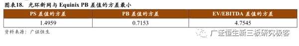 進一步地,我們計算兩家企業(yè)三類估值方法的差值的方差,以此來判斷國內(nèi)IDC企業(yè)最適宜的估值方法。通過計算,兩家企業(yè)PS差值的方差為1.4959,PB差值方差為0.7153,EV/EBITDA差值方差為4.7545,可以看出PB差值的方差最小,這說明考慮國內(nèi)市場相對美股市場的溢價后,光環(huán)新網(wǎng)與Equinix的PB值最為接近,證明PB估值對于國內(nèi)與美股的IDC企業(yè)均具有適用性,而科創(chuàng)板制度上與美股類似,但仍處國內(nèi)環(huán)境,因此對于科創(chuàng)板的IDC企業(yè)來說,PB是適宜的估值方法。