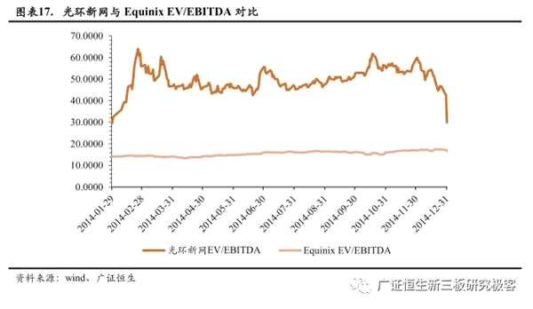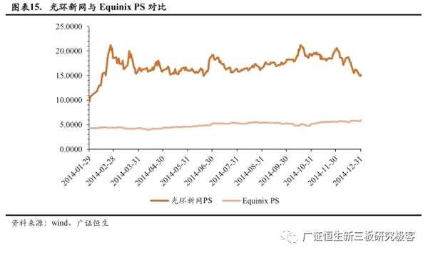 光環(huán)新網(wǎng)2014-2015年主營IDC業(yè)務,同時14年的主要收入來源IDC及其增值業(yè)務與Equinix業(yè)務較相近,因此我們選取兩家2014年的數(shù)據(jù)進行對比,判斷國內(nèi)IDC企業(yè)適用估值方法。