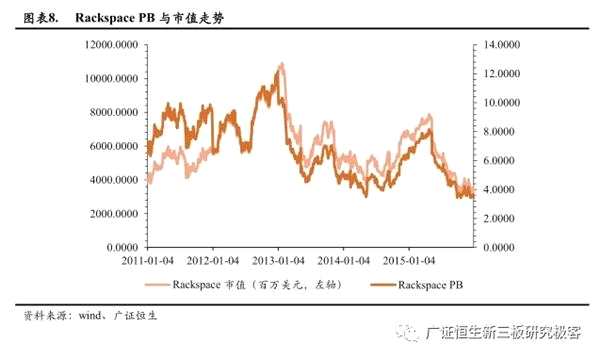 Rackspace PS在1.8-10.0X之間,PB在3.4-12.1X之間,EV/EBITDA在5.8-31.3X之間。Rackspace是IaaS領域的領導者,因此我們選取Rackspace看美股IaaS估值倍數(shù)。Rackspace PS與PB相對穩(wěn)定,PS與PB值均于2012年12月31日達到最大值9.9840、12.1310,之后逐漸下降,直至2015年10月21日的最低值1.8450、3.4197;EV/EBITDA則波動較大,于2012年12月20日達到最大值31.2625,之后逐漸下降,于2015年12月31日達到最低值5.8148。