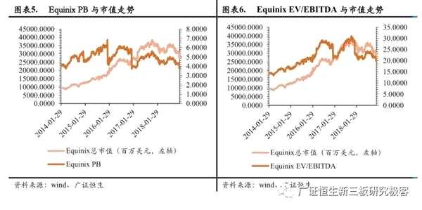 Equinix PB在3.7-6.9X之間,EV/EBITDA在13.2-31.0X之間。Equnix是全球IDC市場市占率最大的企業(yè),因此我們將以Equinix為例,探尋美股IDC企業(yè)的估值倍數(shù)。Equinix的PB值一直維持在穩(wěn)定水平,2015年12月31日達到最大值6.8402,2017年1月3日為PB降至最低值3.7397。而其企業(yè)倍數(shù)在2014年-2017年不斷上升,從2014年4月11日的最低值13.2981上升至2017年11月8日的最大值31.0359,波動較大;2018年以后則逐漸穩(wěn)定在20-24X之間。