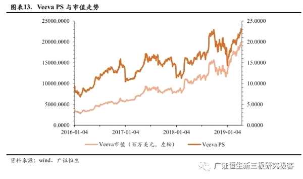 垂直SaaS企業(yè)我們選取Veeva,因為Veeva擁有超過300家企業(yè)客戶,其中包含世界最大的制藥集團,是生命科學行業(yè)領先的垂直SaaS企業(yè)。其PS值相對通用SaaS企業(yè)來說波動更大,其PS最低值為2016年2月15日的6.7944,最大值為2019年4月10日的23.0895。