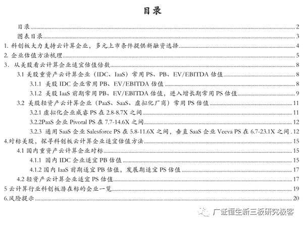 摘要 【科創(chuàng)板云計算企業(yè)適宜估值方法與估值倍數(shù)探討】科創(chuàng)板重點推薦包括云計算在內(nèi)的新一代信息技術領域,允許尚未盈利的企業(yè)上市的多元包容的上市條件也為初具規(guī)模的云計算公司提供了新的融資選擇。另外允許虧損企業(yè)上市,傳統(tǒng)主流的PE估值法便不再普遍適宜,估值成了一大難點,同時科創(chuàng)板采用市場詢價機制,對于機構而言如何準確估值便成了重中之重。(廣證恒生) l 科創(chuàng)板設立利好云計算企業(yè),準確估值成重難點