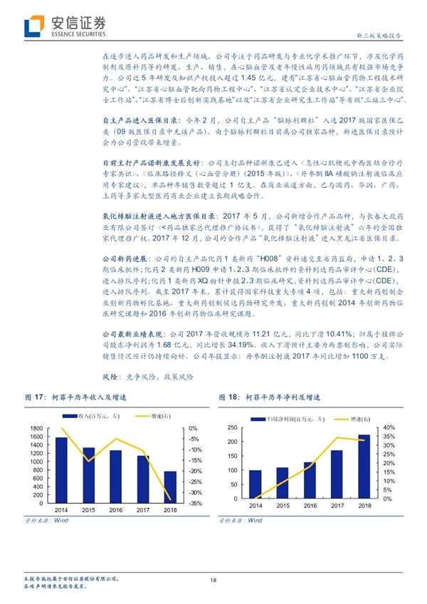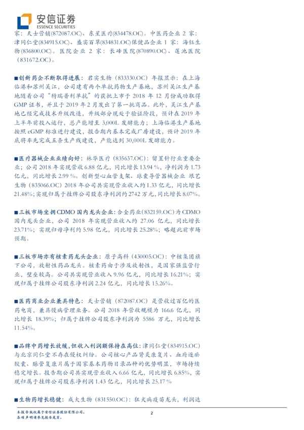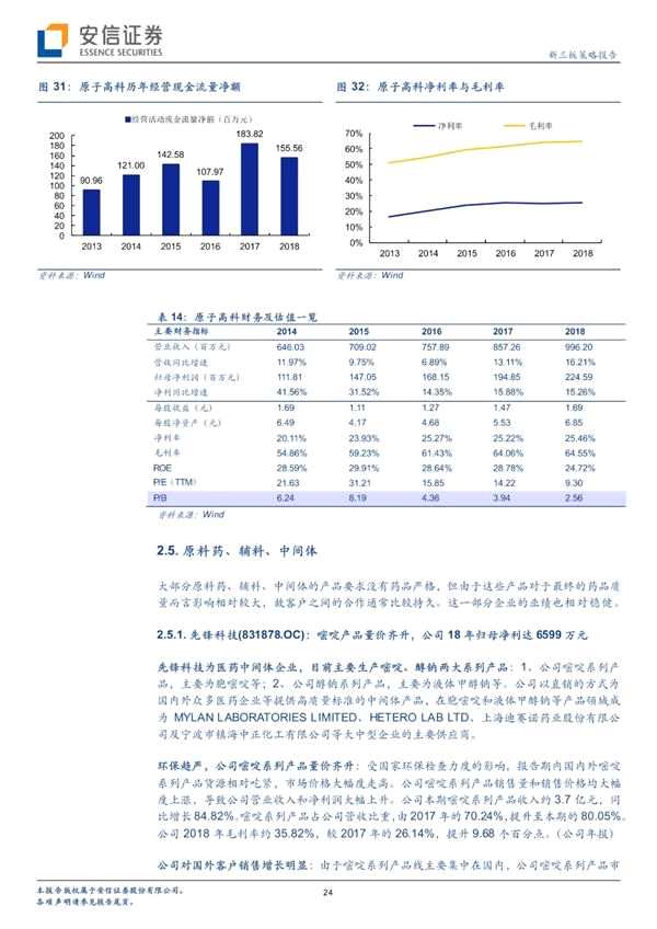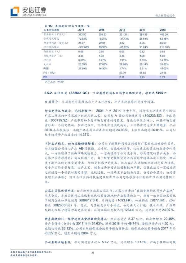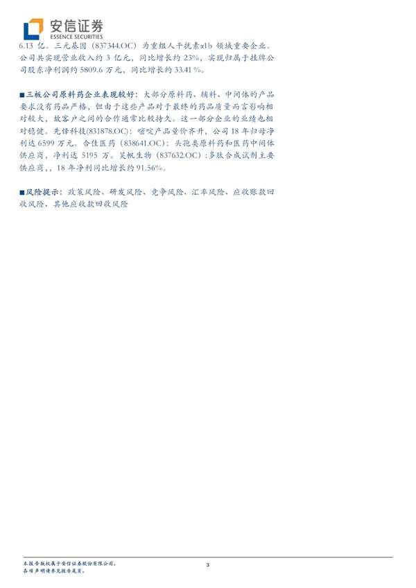 三板公司原料藥企業(yè)表現(xiàn)較好:大部分原料藥、輔料、中間體的產(chǎn)品要求沒有藥品嚴格,但由于這些產(chǎn)品對于最終的藥品質(zhì)量而言影響相對較大,故客戶之間的合作通常比較持久。這一部分企業(yè)的業(yè)績也相對穩(wěn)健。先鋒科技(831878.OC):嘧啶產(chǎn)品量價齊升,公司18年歸母凈利達6599萬元。合佳醫(yī)藥(838641.OC):頭孢類原料藥和醫(yī)藥中間體供應(yīng)商,凈利達5195萬。昊帆生物(837632.OC):多肽合成試劑主要供應(yīng)商,18年凈利同比增長約91.56%。