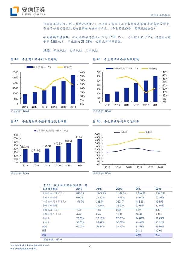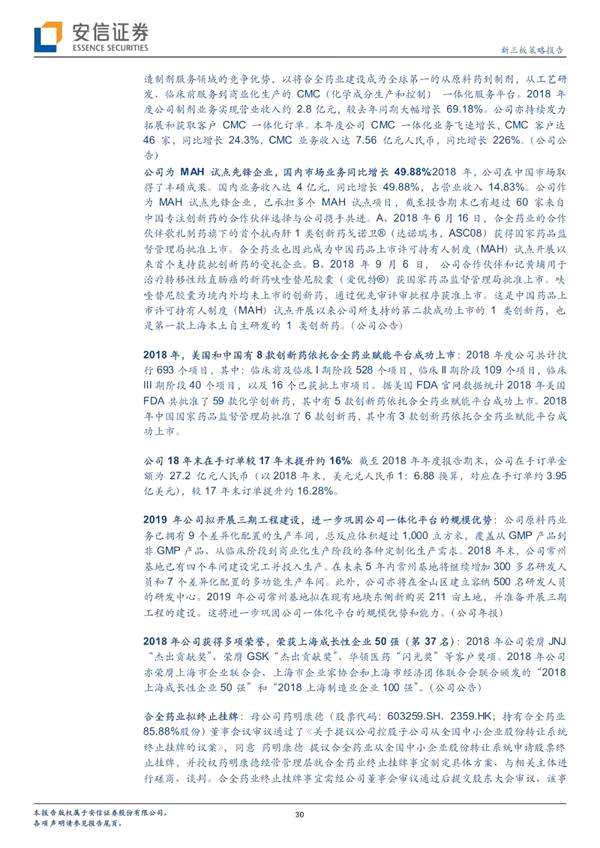 三板市場坐擁CDMO國內(nèi)龍頭企業(yè):合全藥業(yè)(832159.OC)為CDMO國內(nèi)龍頭企業(yè),公司2018年實現(xiàn)營業(yè)收入約27.06億元,同比增長23.71%;實現(xiàn)歸母凈利約5.98億元,同比增長25.28%;略超此前市場預(yù)期。