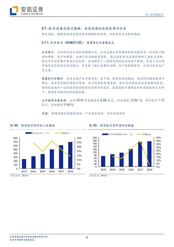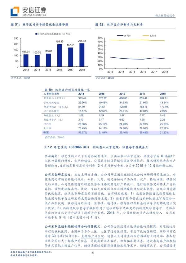 醫(yī)療器械企業(yè)業(yè)績向好:林華醫(yī)療(835637.OC):留置針行業(yè)重要企業(yè);公司2018年實現(xiàn)營收6.88億元,同比增長13.94 %,凈利潤為1.73億元,同比增長2.99 %。創(chuàng)新型心血管支架、球囊導(dǎo)管器械企業(yè)垠藝生物(835066.OC)2018年公司共實現(xiàn)營業(yè)收入約1.33億元,同比增長21.48%;實現(xiàn)歸屬于掛牌公司股東凈利潤約2742萬元,同比增長8.07%。