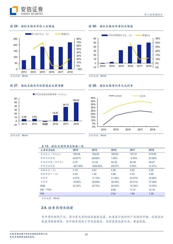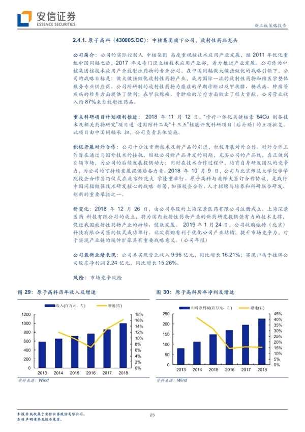 三板市場亦有核素藥龍頭企業(yè):原子高科(430005.OC):中核集團旗下公司,放射性藥品龍頭。核素藥由于涉及放射性,是國家強監(jiān)管行業(yè),壁壘較高。公司共實現(xiàn)營業(yè)收入9.96億元,同比增長16.21%;實現(xiàn)歸屬于掛牌公司股東凈利潤2.24億元,同比增長15.26%。