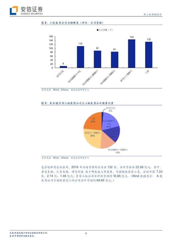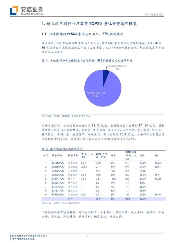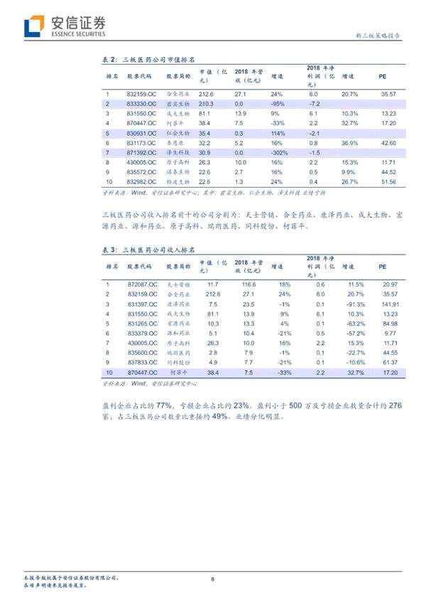 三板醫(yī)藥盈利企業(yè)占比達77%:599家醫(yī)藥生物公司中,563家醫(yī)藥公司已發(fā)布年報(占比94%),36家醫(yī)藥公司未能按期披露年報(占比6%)。剔除虧損公司,三板醫(yī)藥企業(yè)盈利共88.13億元,盈利企業(yè)收入合計約871.84億元。盈利企業(yè)占比約77%,虧損企業(yè)占比約23%。盈利小于500萬及虧損企業(yè)數(shù)量合計約276家,占三板醫(yī)藥公司數(shù)量比重接約49%。業(yè)績分化明顯。盈利過億的三板醫(yī)藥公司共9家,分別為:成大生物、合全藥業(yè)、玉星生物、原子高科、柯菲平、林華醫(yī)療、津同仁堂、盛實百草、永順生物,合計盈利約25.3億元,占全部三板醫(yī)藥公司利潤額比重約29%。盈利過億的三板醫(yī)藥公司整體利潤增速約13.7%。