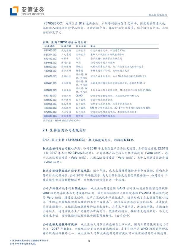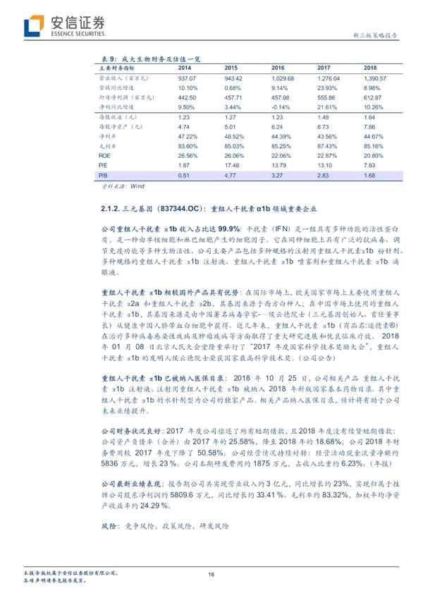 生物藥增長穩(wěn)?。撼纱笊?831550.OC):狂犬病疫苗龍頭,利潤達6.13億。三元基因(837344.OC)為重組人干擾素α1b領(lǐng)域重要企業(yè)。公司共實現(xiàn)營業(yè)收入約3億元,同比增長約23%,實現(xiàn)歸屬于掛牌公司股東凈利潤約5809.6萬元,同比增長約33.41 %。