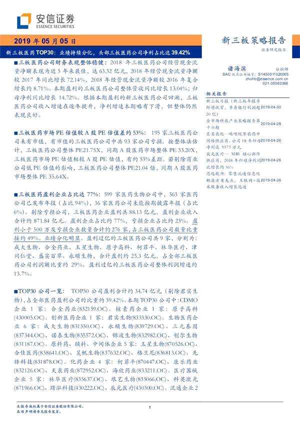 新三板醫(yī)藥TOP30:業(yè)績持續(xù)分化 頭部三板醫(yī)藥公司凈利占比達39.42%