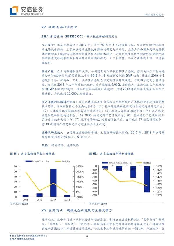 創(chuàng)新藥企不斷取得進展:君實生物(833330.OC)年報顯示:在上海臨港和蘇州吳江,公司建有兩個單抗藥物生產(chǎn)基地,蘇州吳江生產(chǎn)基地隨著公司“特瑞普利單抗”的獲批上市于2018年12月份成功取得GMP證書,并且于2019年2月發(fā)出了第一批商品。此外,吳江生產(chǎn)基地已經(jīng)完成技術(shù)升級改造,升級部分現(xiàn)處于驗證階段,預(yù)計在2019年上半年前投入運行,總產(chǎn)能增至3,000L發(fā)酵能力;上海臨港生產(chǎn)基地按照cGMP標準進行建設(shè),報告期內(nèi)基本完成廠房建設(shè),預(yù)計2019年底將率先完成五條生產(chǎn)線建設(shè),產(chǎn)能達到30,000L發(fā)酵能力。