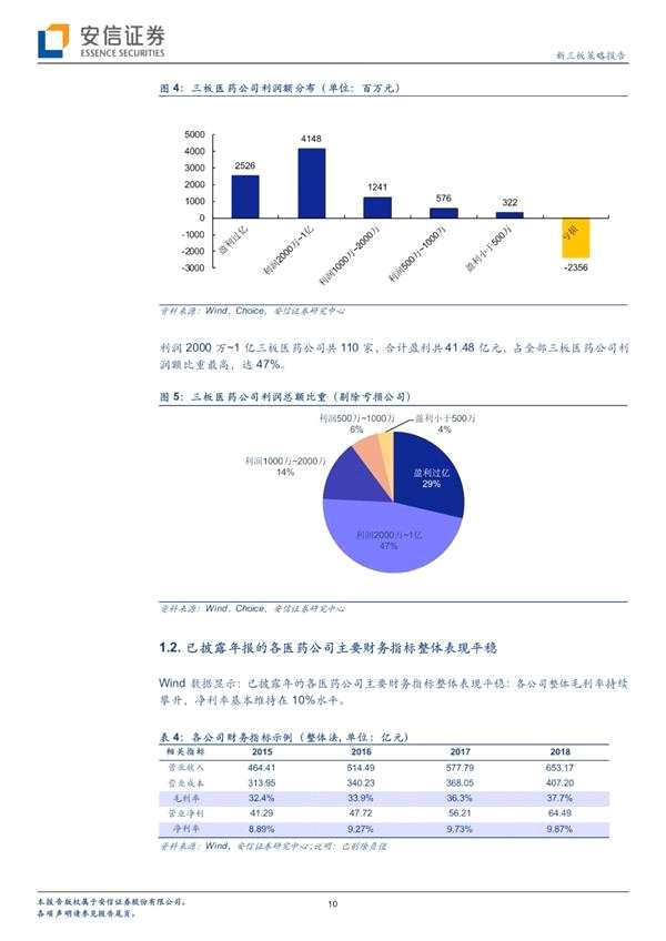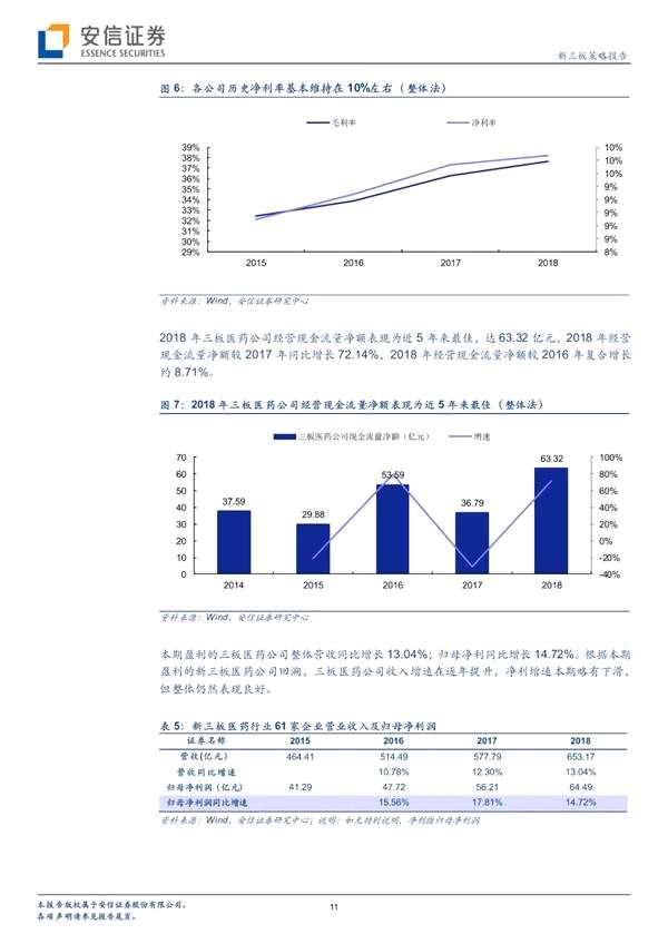 摘要 【新三板醫(yī)藥TOP30:業(yè)績持續(xù)分化 頭部三板醫(yī)藥公司凈利占比達39.42%】三板醫(yī)藥公司財務(wù)表現(xiàn)整體穩(wěn)?。?018年三板醫(yī)藥公司經(jīng)營現(xiàn)金流量凈額表現(xiàn)為近5年來最佳,達63.32億元,2018年經(jīng)營現(xiàn)金流量凈額較2017年同比增長72.14%,2018年經(jīng)營現(xiàn)金流量凈額較2016年復(fù)合增長約8.71%。本期盈利的三板醫(yī)藥公司整體營收同比增長13.04%;歸母凈利同比增長14.72%。根據(jù)本期盈利的新三板醫(yī)藥公司回溯,三板醫(yī)藥公司收入增速在逐年提升,凈利增速本期略有下滑,但整體仍然表現(xiàn)良好。(安信證券 ) 三板醫(yī)藥公司財務(wù)表現(xiàn)整體穩(wěn)?。?/strong>2018年三板醫(yī)藥公司經(jīng)營現(xiàn)金流量凈額表現(xiàn)為近5年來最佳,達63.32億元,2018年經(jīng)營現(xiàn)金流量凈額較2017年同比增長72.14%,2018年經(jīng)營現(xiàn)金流量凈額較2016年復(fù)合增長約8.71%。本期盈利的三板醫(yī)藥公司整體營收同比增長13.04%;歸母凈利同比增長14.72%。根據(jù)本期盈利的新三板醫(yī)藥公司回溯,三板醫(yī)藥公司收入增速在逐年提升,凈利增速本期略有下滑,但整體仍然表現(xiàn)良好。