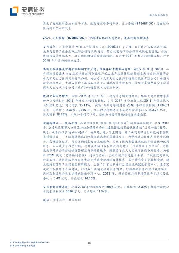 醫(yī)藥商業(yè)企業(yè)兼具特色:天士營銷(872087.OC)是營收過百億的醫(yī)藥電商,兼具慢病管理業(yè)務(wù)。公司2018年營收規(guī)模為166.6億元,同比增長18.39%;歸屬于掛牌公司股東凈利潤為5586萬元,同比增長11.54%。
