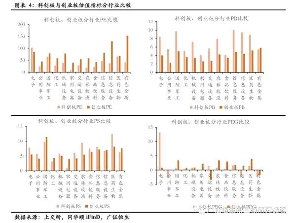 2.2 科創(chuàng)板電子、醫(yī)藥生物行業(yè)的相對估值(對比創(chuàng)業(yè)板)排名前列,分別為1.2、0.95