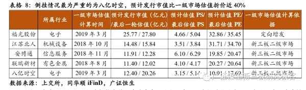 108家企業(yè)預(yù)計發(fā)行后市值/一級市場總市值平均值為6.06、中位數(shù)為2.05。從分布來看,(預(yù)計發(fā)行市值/一級市場市值)在1.5-3倍的企業(yè)最多,占比37.66%。但也有7.79%的企業(yè)一級市場估值高于投行給出的預(yù)計發(fā)行后總市值,出現(xiàn)估值倒掛。倒掛情況最為嚴重的為八億時空,按2019年3月停牌前轉(zhuǎn)讓價格計算的總市值為20.26億元,而投行給出的預(yù)計發(fā)行市值僅有12.40億元,倒掛近40%。