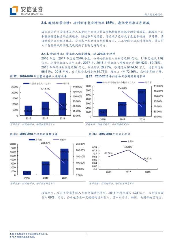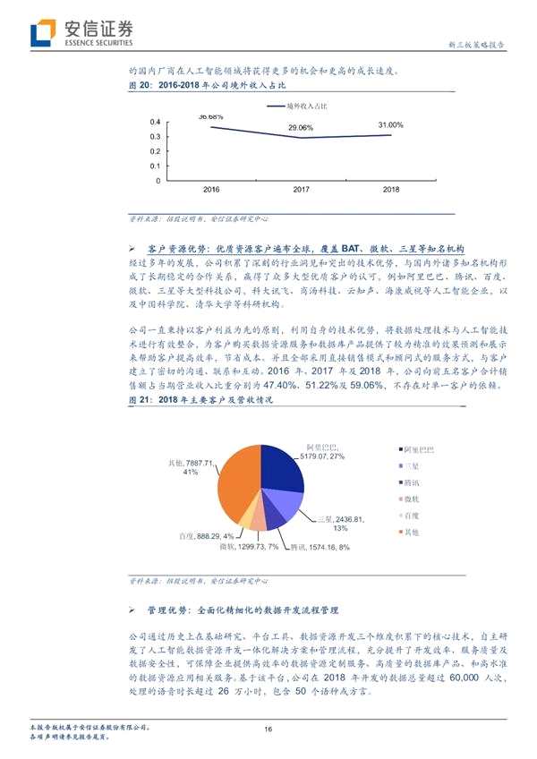 營收主要來自于數(shù)字資源定制服務,2018年對營收貢獻超60%;三大人工智能領域中重點滲透智能語音領域,2018年對營收貢獻超80%;主要面向境內(nèi)銷售,境外客戶遍布日本、美國等地區(qū),2018年境外收入占比達到31%。客戶覆蓋BAT、微軟、三星等知名機構。