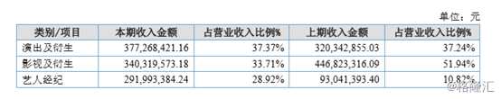 具體來看,報(bào)告期內(nèi)公司主營業(yè)務(wù)為演出及衍生業(yè)務(wù)、影視及衍生業(yè)務(wù)和藝人經(jīng)紀(jì)業(yè)務(wù)。其中,演出及衍生業(yè)務(wù)實(shí)現(xiàn)營收3.77億元,占總營收37.37%,報(bào)告期內(nèi)舞臺(tái)劇演出超2500場。藝人經(jīng)紀(jì)實(shí)現(xiàn)營收2.91億元,占總營收28.92%。需要注意的是,影視及衍生業(yè)務(wù)實(shí)現(xiàn)營收3.4億元,占總營收的比例從2017年的51.94%下滑至33.71%。