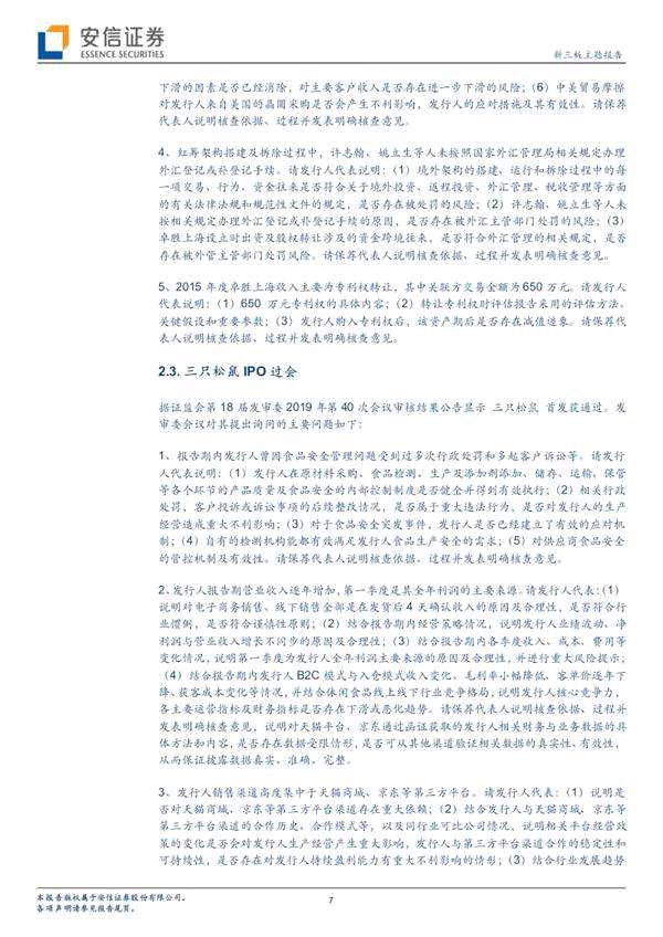 ■過會(huì)公司相關(guān)問詢簡(jiǎn)析:發(fā)審委會(huì)議對(duì)IPO過會(huì)公司,提出了相關(guān)問詢,涉及財(cái)務(wù)方面、經(jīng)營(yíng)方面、合規(guī)方面等問題。我們列示過會(huì)公司相關(guān)問題的用意在于,為后續(xù)申請(qǐng)IPO的公司提供參考。本期過會(huì)企業(yè)主要涉及財(cái)務(wù)方面的問詢:毛利率異常。涉及經(jīng)營(yíng)方面的問詢:關(guān)聯(lián)交易占比較高、前五大客戶的銷售收入占比較高、銷售渠道高度集中于第三方平臺(tái)。合規(guī)方面:關(guān)聯(lián)方資金往來(lái)。