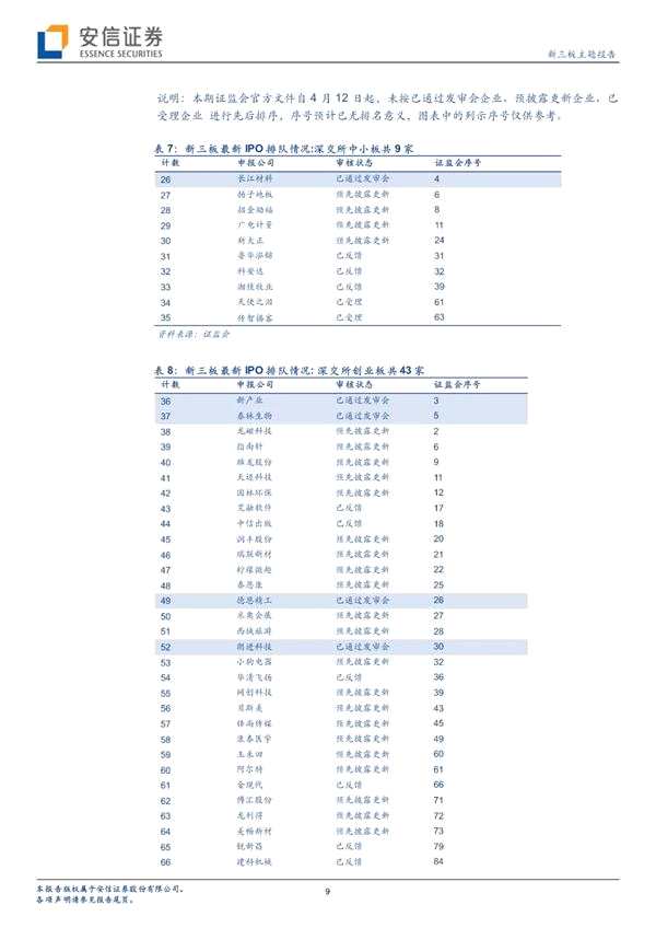 ■目前,新三板企業(yè)IPO排隊(duì)企業(yè)共84家:7家公司處于已過會(huì)待掛牌狀態(tài):分別為【松煬資源(603863)、股吧】、新化股份、長(zhǎng)江材料、新產(chǎn)業(yè)、泰林生物、德恩精工、朗進(jìn)科技。本期新增7家三板公司IPO排隊(duì),分別為:傳智播客、申昊科技、城市縱橫、交大思諾、圖南股份、科思股份、安克創(chuàng)新。近一周,按公告日統(tǒng)計(jì),新增2家三板企業(yè)參與IPO輔導(dǎo):精英數(shù)智、森合高科。