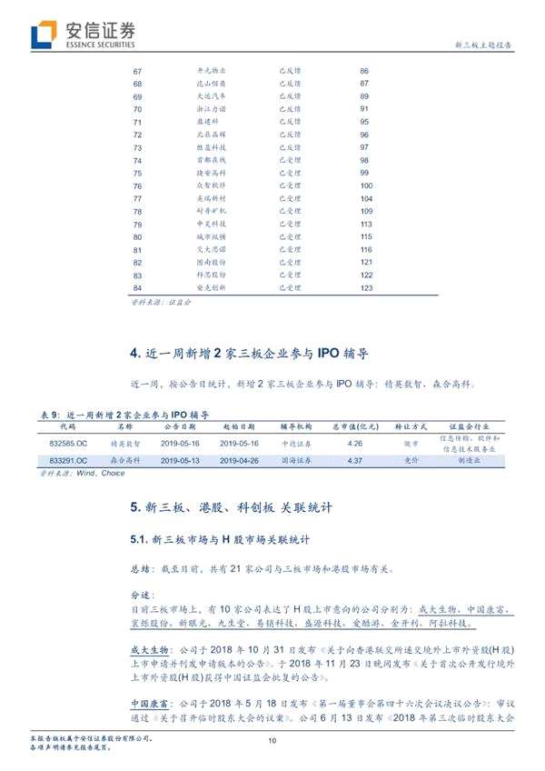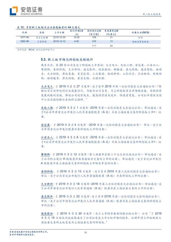 ■新三板、港股、科創(chuàng)板關(guān)聯(lián)統(tǒng)計(jì):截至目前,有21家公司與三板市場(chǎng)和港股市場(chǎng)有關(guān)。本期無(wú)新增公司。目前三板市場(chǎng)有10家公司表達(dá)了H股上市意向:分別為成大生物、中國(guó)康富、寰爍股份、新眼光、九生堂、易銷科技、盛源科技、愛酷游、金開利、阿拉科技。其他相關(guān)公司已摘牌。截至目前,有25家三板公司表達(dá)了科創(chuàng)板上市意向:大力電工、先臨三維、金達(dá)萊、江蘇北人、賽特斯、泰坦科技、久日新材、凌志軟件、現(xiàn)在股份、映翰通、嘉元科技、盛本智能、驅(qū)動(dòng)力、天力鋰能、澤達(dá)易盛、星昊醫(yī)藥、三元基因、聯(lián)瑞新材、八億時(shí)空、京冶軸承、新數(shù)網(wǎng)絡(luò)、西部超導(dǎo)、澤生科技、君實(shí)生物、京源環(huán)保。
